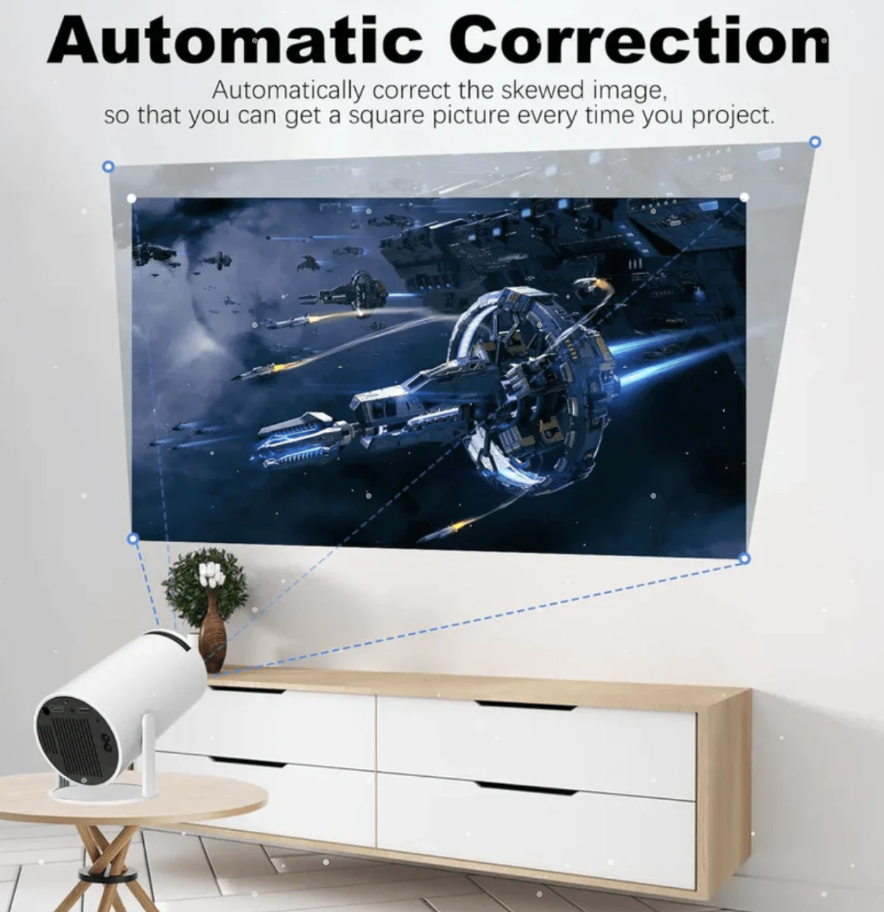 Our smart projector automatically detects and corrects the projection angle — ensuring your picture is always perfectly square and aligned, no matter where you place it.